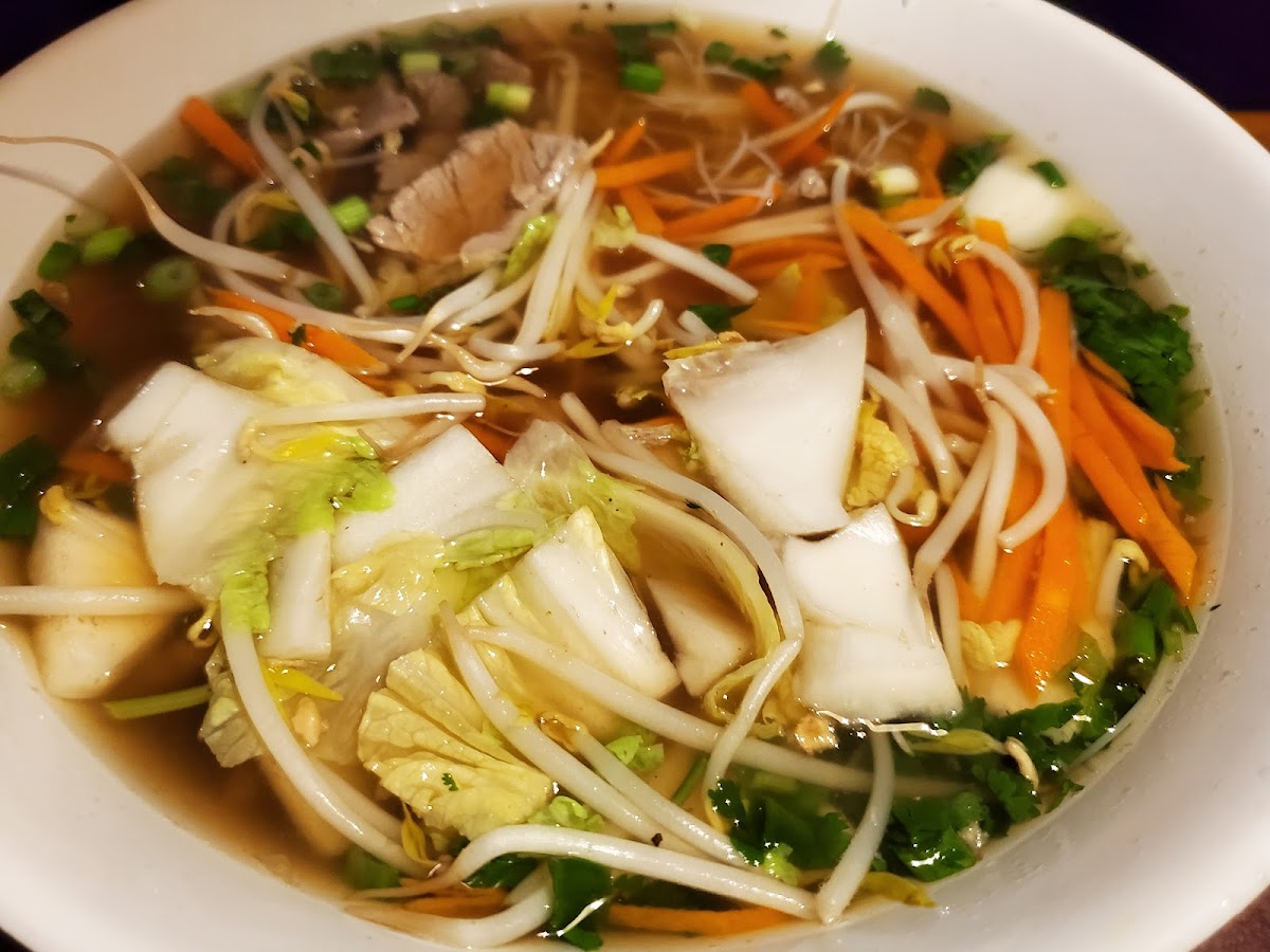 Really good pho! Stopped here on vacation at the recommendation of the hotel staff. Not too crowded and the selection was impressive. We split the pot stickers, I got the beef pho and hubby got the sukiaki (not sure on the spelling). The broth was super flavorful in both our dishes. I do wish the meat was cut either into smaller pieces or thinner because it was a bit chewy and hard to get through with the chop sticks.